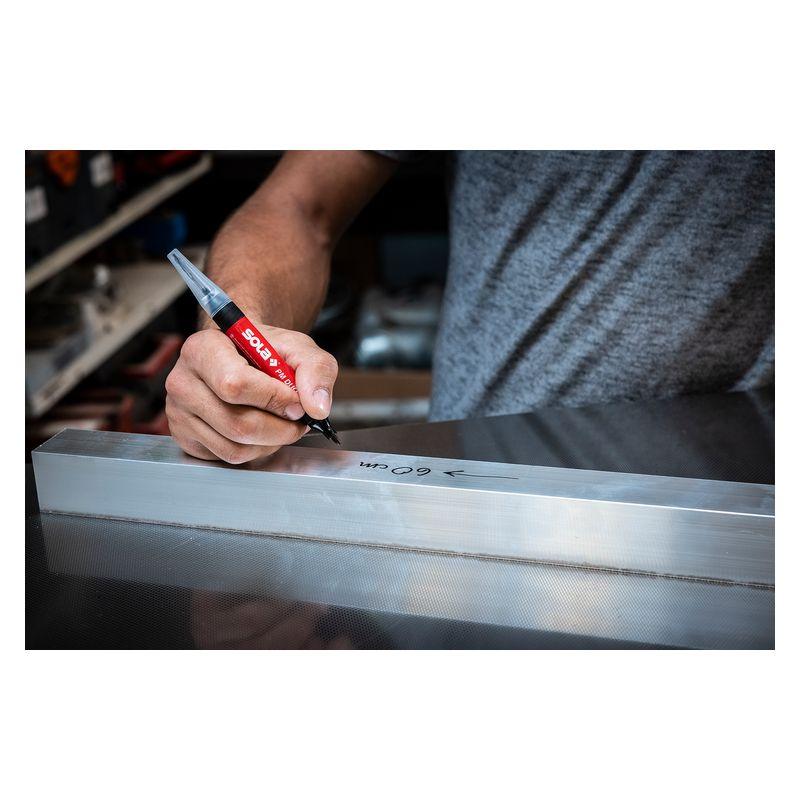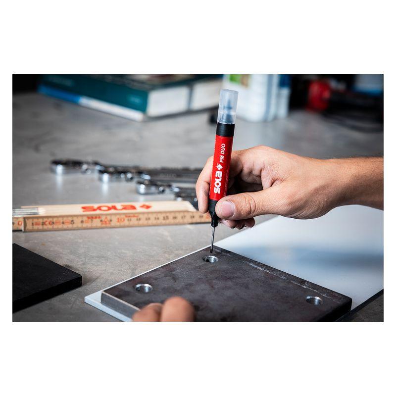 - Συνδυάζει έναν μαρκαδόρο για βαθιές τρύπες (deep hole marker) και έναν κλασικό ανεξίτηλο μαρκαδόρο σε ένα εργαλείο.