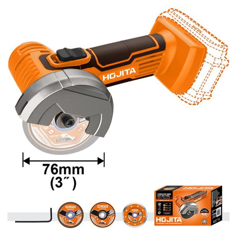 Ο γωνιακός τροχός mini Hojita 20V είναι σχεδιασμένος για ακριβείς και γρήγορες κοπές και λειάνσεις. Με 19500rpm στροφές χωρίς φορτίο και δίσκο διαμέτρου 76mm, προσφέρει εξαιρετική απόδοση για μικρές αλλά απαιτητικές εργασίες. Ο άξονας M6 εξασφαλίζει ασφαλή τοποθέτηση δίσκου, ενώ η δυνατότητα τοποθέτησης δίσκου αριστερά βελτιστοποιεί την εργονομία.