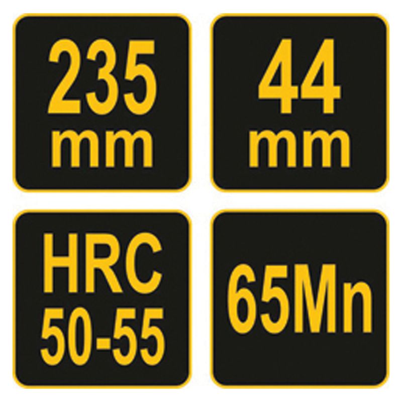- Το μαχαίρι είναι κατασκευασμένο από χάλυβα μαγγανίου με το σύμβολο 65Mn, σκληρυμένο σε 50-55 HRC, πλάτος μαχαιριού 44 mm.
