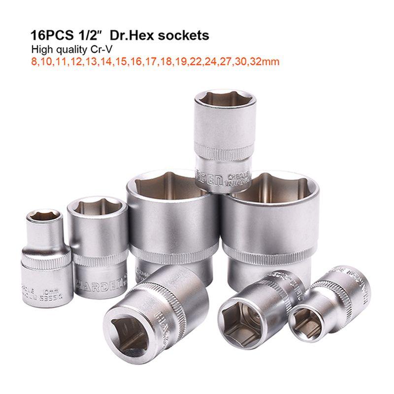 - 16 ΤΕΜ 1/2″ Dr. Hex υποδοχές: 8,10,11,12,13,14,15,16,17,18,19,22,24,27,30,32mm